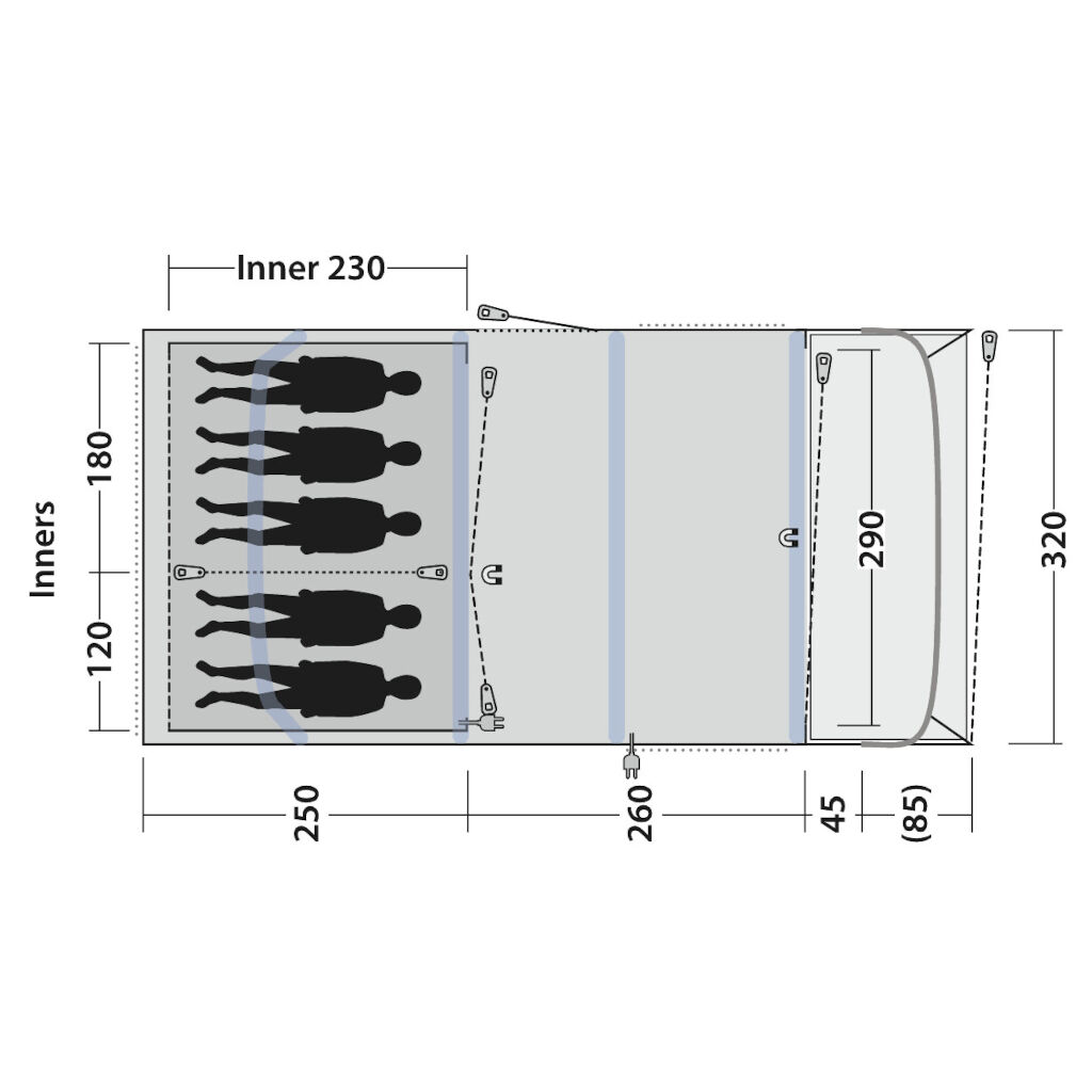 Outwell Florida 5 Air er et familietelt designet for familier eller grupper på opptil fem personer, men vi anbefaler det også for familier med to barn da den ekstra plassen i soverommene gir mer plass til bagasje og bredere senger. Det romslige oppholdsrommet med store vinduer gjør teltet lyst og behagelig, slik at uansett vær er det plass til å spise og være sammen på ferien. Den store beskyttede frontåpningen kan åpnes i to seksjoner, slik at den kan åpnes helt på varme dager eller delvis for ventilasjon samtidig som den gir beskyttelse mot vind og innsyn. Et forseglet gulv sydd til ytterteltet beskytter mot vind, insekter og smuss.