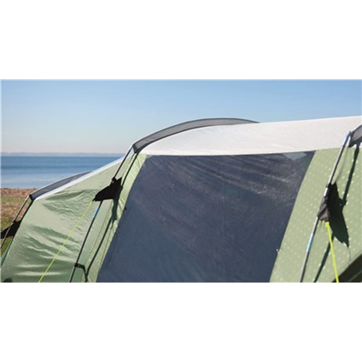 Tältet har en ordentligt tilltagen ventilation med en bred ventil bak. Ventilationen går reglera för att få önskat luftflöde. Familjetältets dörr är utrustad med en myggnästdörr för extra ventilation. Tältduken är helt vattentät med tejpade sömmar och är flamskyddsbehandlad. Innertältet är förmonterat vid leverans och behöver inte lossas när tältet packas ihop. Stängerna är färgmarkerade för enklare montering.