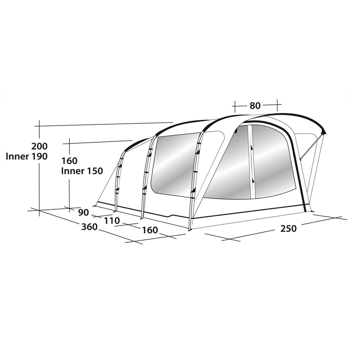 Tack vare de stora fönstren, takhöjden på 200 cm och de vid taket bockade stänger är allrummet väldigt rymligt för tältets storlek och det går bra att inreda med ett mindre bord och stolar för umgänge på kvällar och regniga dagar. De tonade fönstren ger ett mycket behagligt ljus i hela rummet samtidigt som de minskar insynen. Tältets fönster är dessutom utrustade med ihoprullningsbara gardiner som justeras i tre lägen vilket gör det enkelt att välja hur mycket ljus eller insyn man vill ha. En fördel är att även dörren till sovkabinen går öppna helt för att göra tältet till ett enda stort rum.