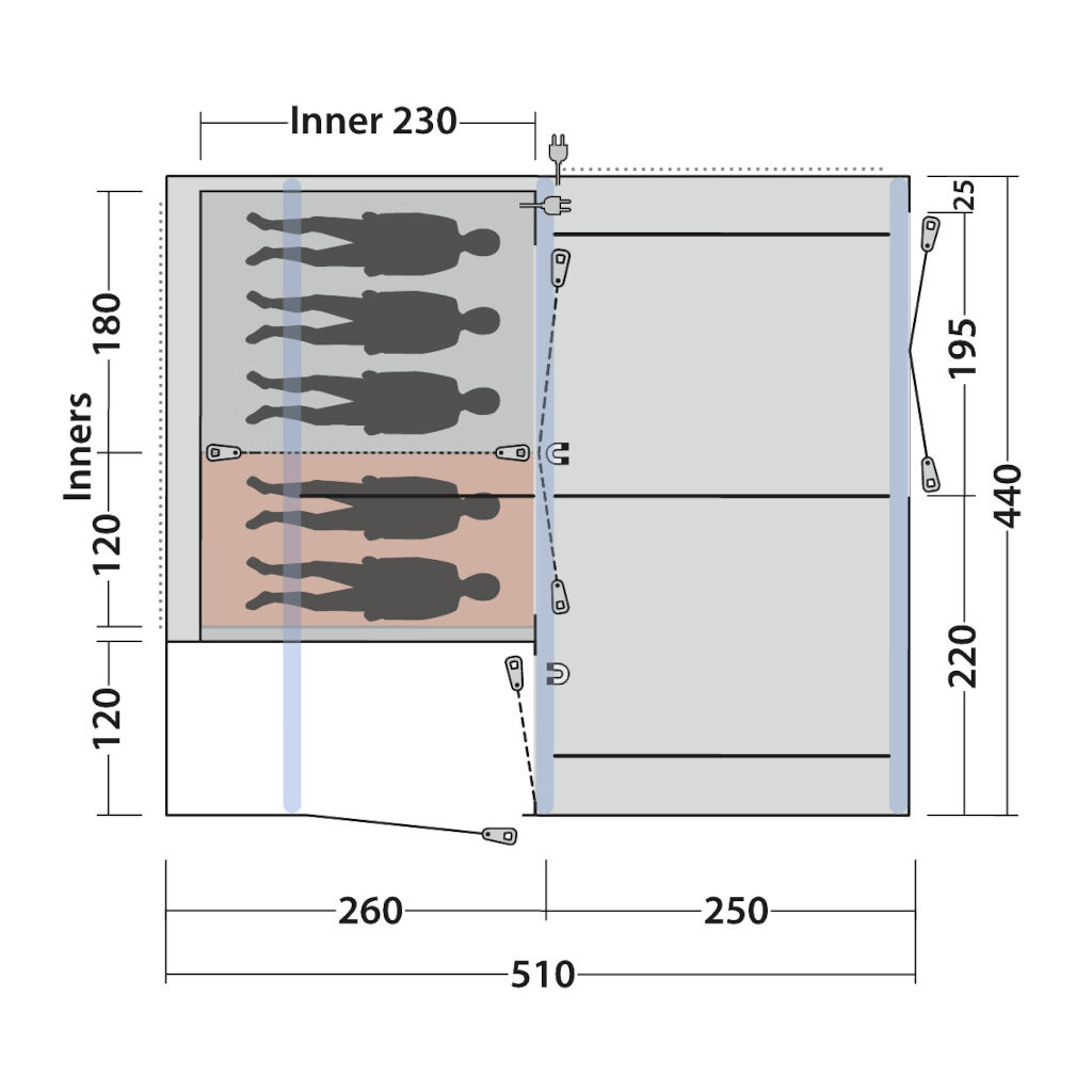 Ett av soverommene og døren til lagringsområdet har en magnetlist i tillegg til glidelåsen, slik at de kan åpnes og lukkes uten å bruke glidelåsen (Outwell Quick & Quiet Inner Door). En løsning som gjør det mulig å gå inn og ut av sovekabinen uten å vekke resten av familien.