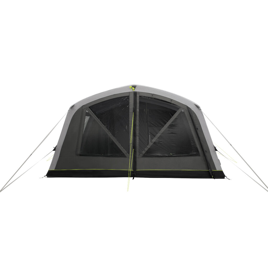 Det lyse oppholdsrommet har store tonede vinduer som reduserer innsyn og varme, samtidig som det skaper et behagelig miljø for avslapning og samvær. Den firkantede formen og buede luftkanalene gir ekstra takhøyde og bevegelsesfrihet. Takket være doble dører – en regnsikker sideinngang og en stor frontåpning – er teltet både fleksibelt og lett tilgjengelig uansett vær.