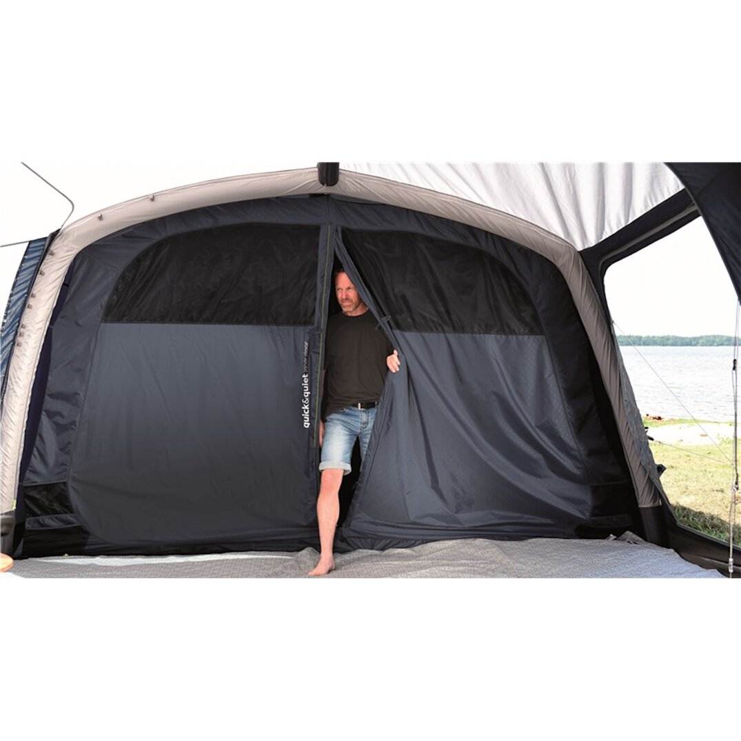 Det store soverommet har i tillegg til glidelåsen en magnetlist slik at den kan åpnes og lukkes uten glidelås (Outwell Quick & Quiet Inner door). En løsning som gjør at det går å komme inn og ut av sovekabinen uten å vekke resten av familien.