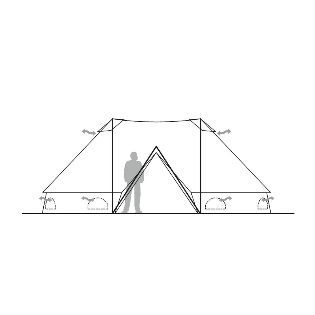 Teltet er lett tilgjengelig gjennom den store A-formede åpningen, og til tross for sentrumstengene er det takket være det høye taket i midten romslig og enkelt å bevege seg i. Døren beskyttes av en overhengende kant, noe som gjør at den kan være åpen selv i lett regn. Døren er delt i to deler, så man kan velge hvor mye man vil åpne opp. Begge dører er utstyrt med nettingmønster.