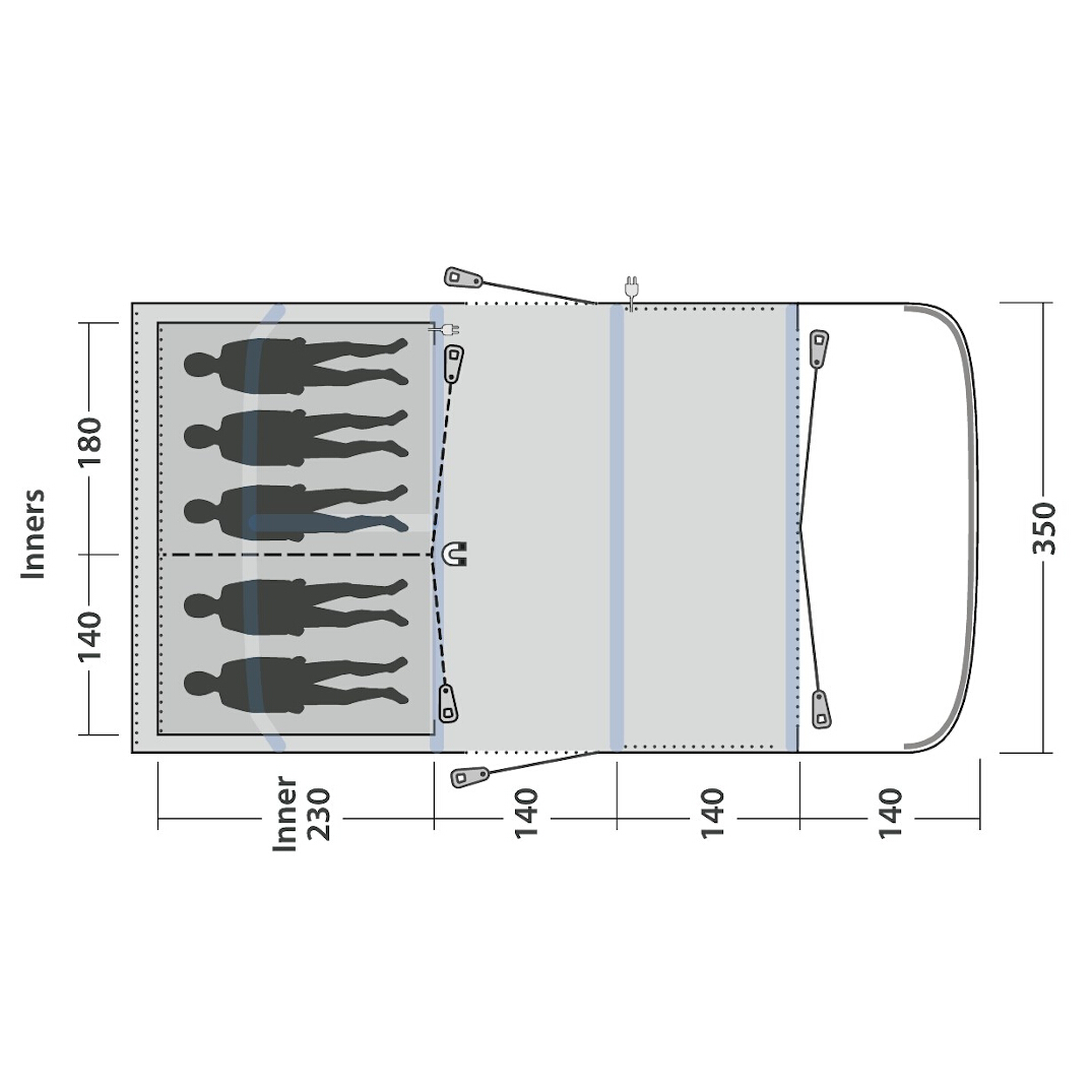 Sovkabinen er delt opp i to soverom med plass til tre henholdsvis to personer. Veggen mellom soverommene kan tas bort hvis man ønsker å samle hele familien i ett stort soverom. Takket være at også sovkabinen har 35% bomull i seg, får den et bedre klima enn tradisjonelle familietelt som ofte har sovekabiner i 100% polyester.