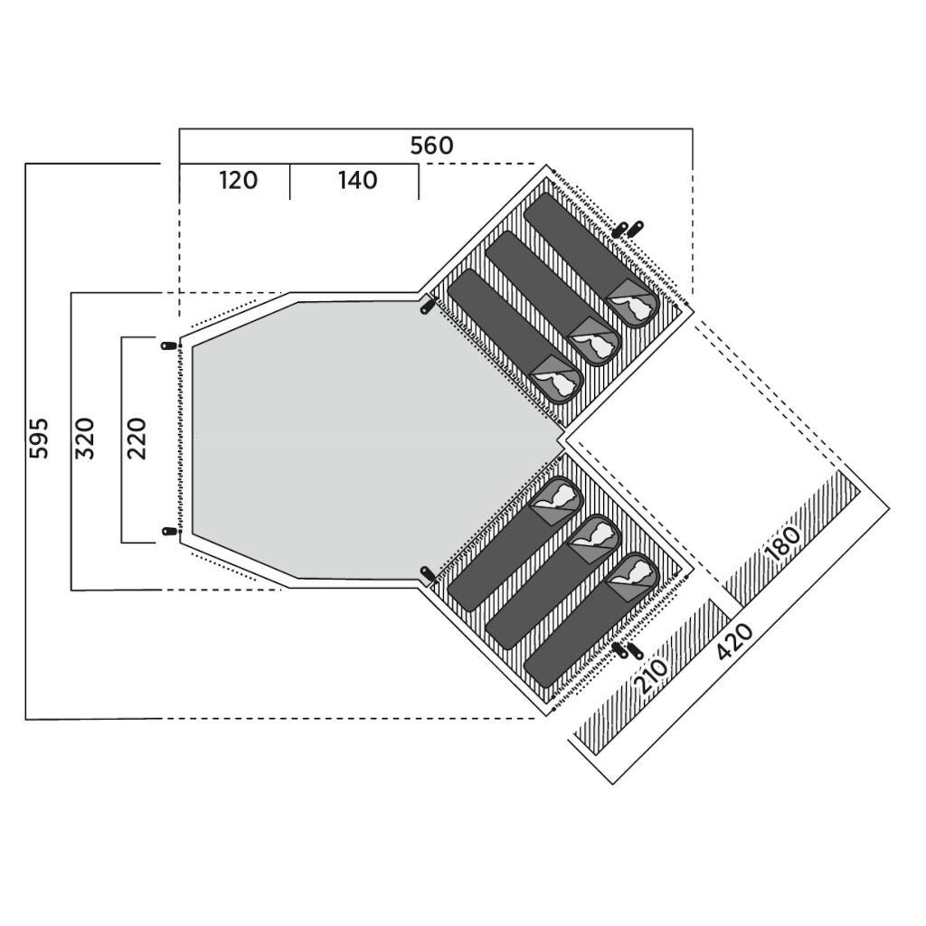 Familietelt med oppholdsrom og to separate sovekabiner med fleksible innganger. Et romslig oppholdsrom gir plass til å møblere og sosialisere, og de to mørke sleeptight+ sovekabinene beskytter mot morgensol og rommer tre personer hver. En stor inngang foran og ekstra innganger bak på hver sovekabin gir gode muligheter for møblering og gjør det enkelt å gå inn og ut av teltet uten å forstyrre de som sover i den andre sovekabinen. Teltet har et duk som er tålig mot regn og vind samt fargekodede stenger for enkel oppsetting. Perfekt for familien med større barn som ønsker eget krypinn eller for to grupper som ønsker å dele telt.