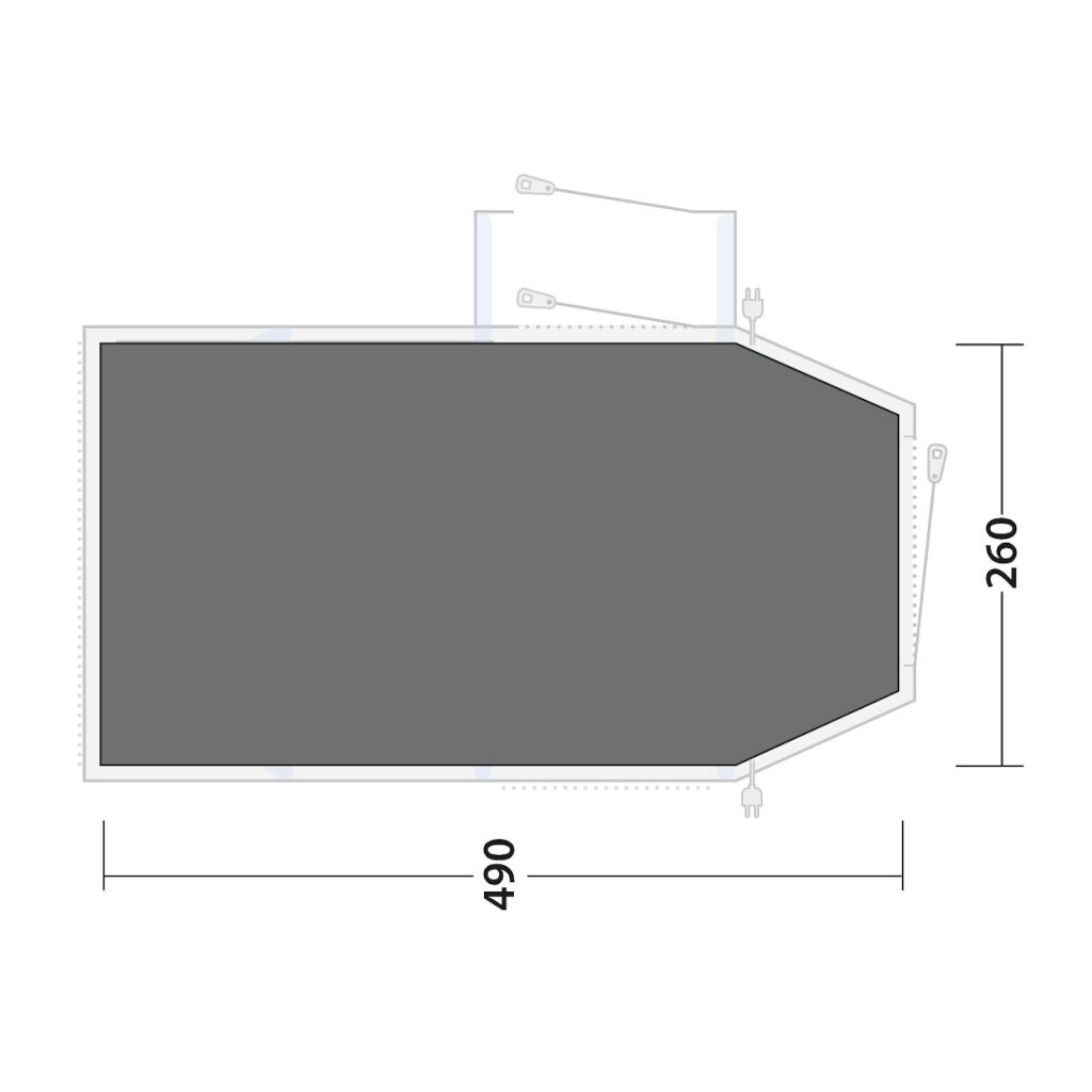LES MERSpesialtilpasset gulvbeskyttelse som legges under familieteltet før det settes opp. Gulvbeskyttelsen holder teltets bunnduk ren og tørr og reduserer slitasjen på den.